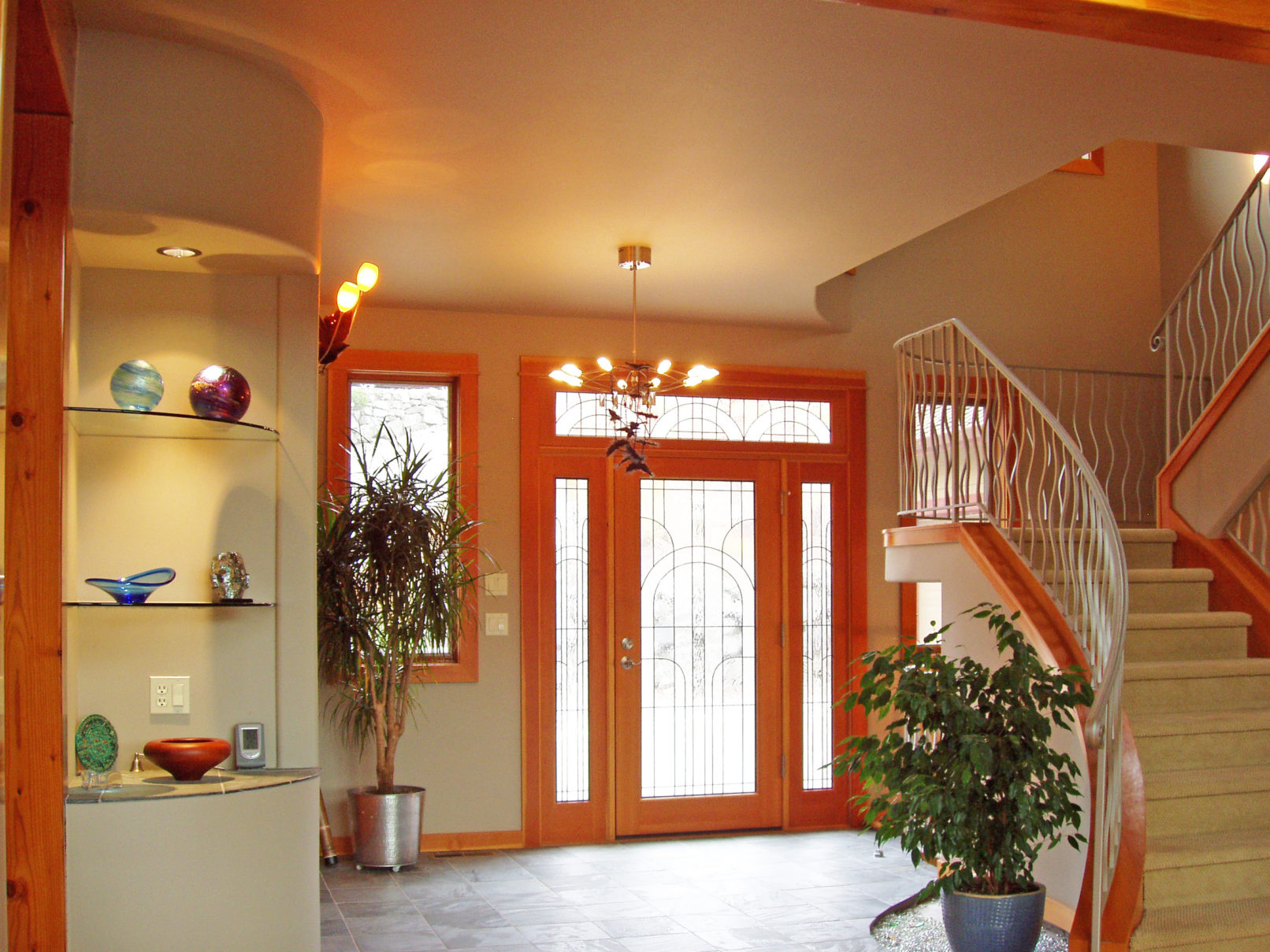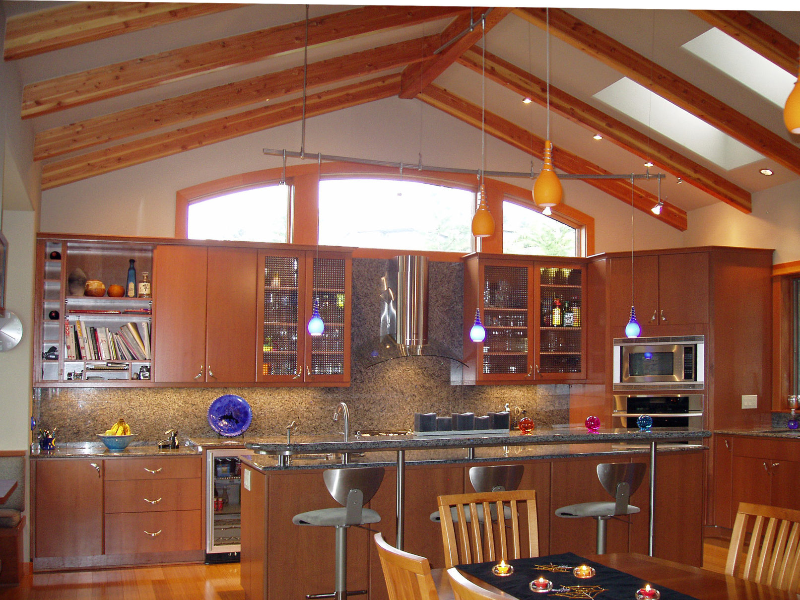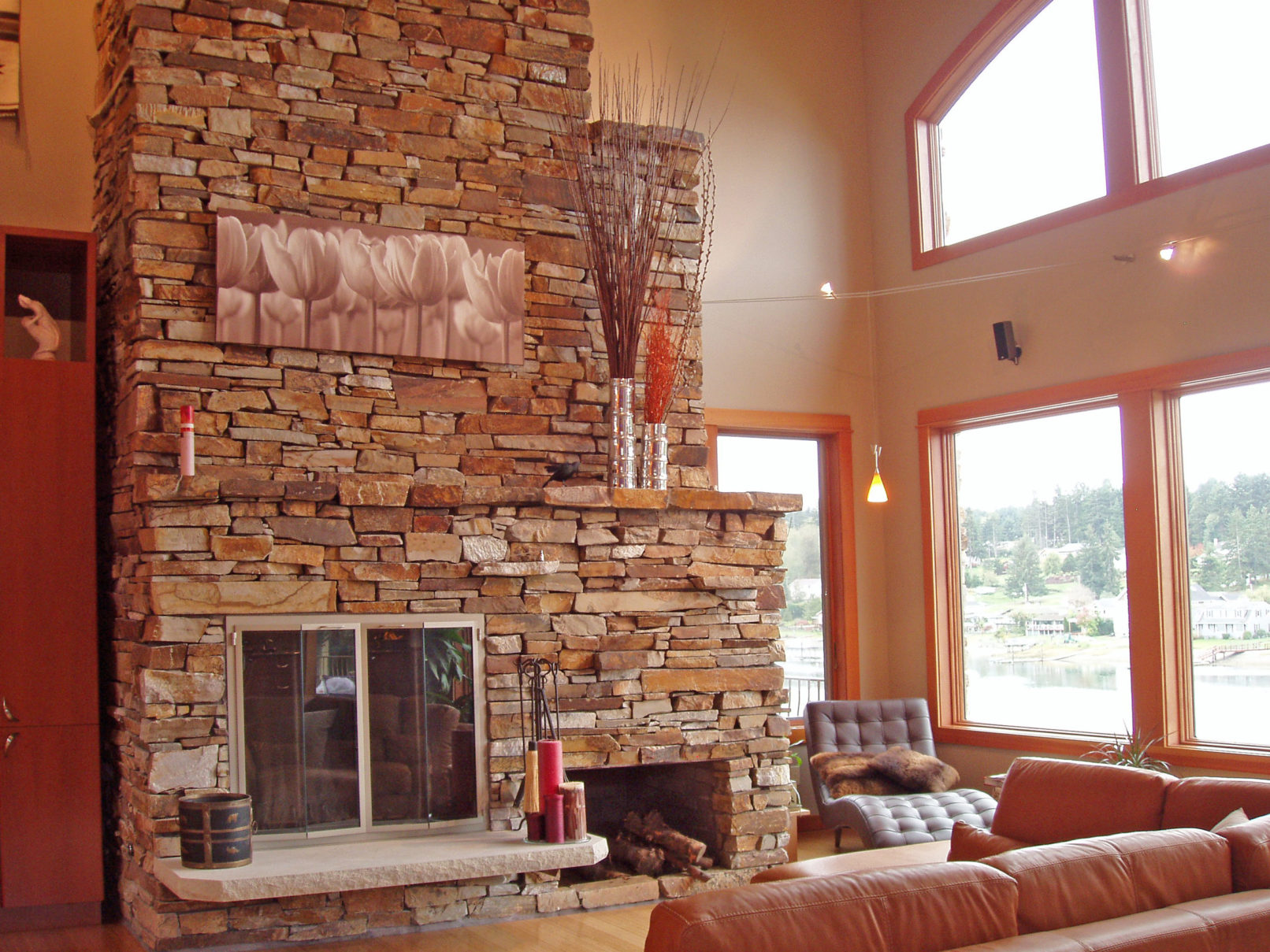 This custom design & built home sits on a steep waterfront lot. It’s like being up on a mountain lake or stream yet it is close in to town. By using timber frame detailing in a conventionally built home, construction came in on budget without sacrificing any of the amenities. Contemporary finishes inside merge with exposed beams, natural stone and radiant floor heat over bamboo flooring. You have to like stairs but the view is worth it.